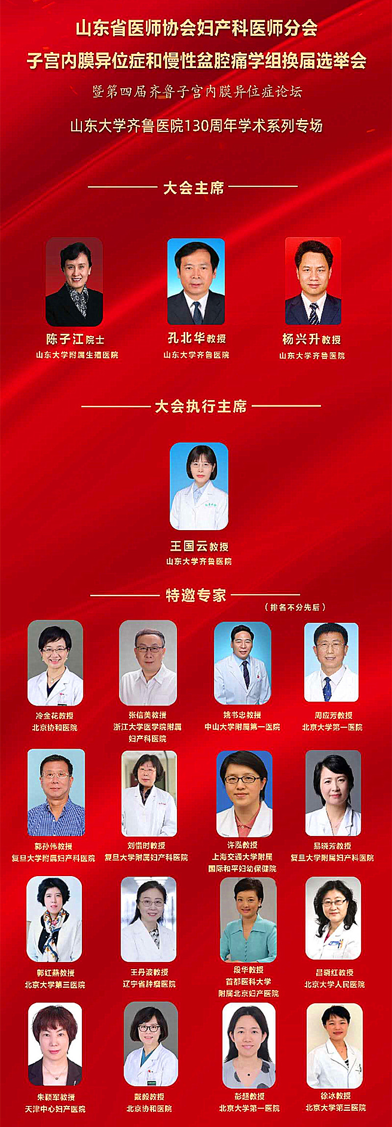 10月23日至25日,山东省医师协会妇产科医师分会子宫内膜异位症和慢性盆腔痛学组换届选举会暨第四届齐鲁子宫内膜异位症论坛山东大学齐鲁医院130周年学术系列专场盛大举行。大会由山东大学附属生殖医院陈子江院士、山东大学齐鲁医院孔北华教授、山东大学齐鲁医院杨兴升教授担任主席。山东大学齐鲁医院王国云教授担任大会执行主席。来自北京协和医院、北京大学人民医院、北京大学第三医院、首都医科大学附属北京妇产医院、复旦大学附属妇产科医院、中山大学附属第一医院、浙江大学医学院附属妇产科医院、天津中心妇产医院、辽宁省中心医院以及上海交通大学附属国际和平妇幼保健院等十余位专家教授出席。